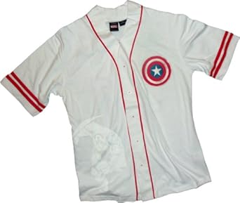 Product Description : This adult Marvel Comics Baseball Jersey is an officially licensed product and features our cool Captain America design provided on soft polycotton. This jersey features all-over printing, striped cloth trim, buttoned front, and embroidered applique embellishments.